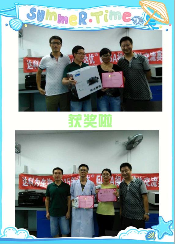 上午9點(diǎn)半正式開始,先是由相關(guān)人員講解比賽的注意事項(xiàng)及評(píng)分標(biāo)準(zhǔn),然后參賽人員開始正常操作比賽。這次參賽的人員有來(lái)自彭濤課題組、黃俊課題組的學(xué)生以及研究所的技術(shù)人員。此次參賽的大部分人員由于都有一定的ELISA實(shí)驗(yàn)基礎(chǔ),因此比賽的流程進(jìn)行地比較順暢,其中有一位同學(xué)接下來(lái)的課題剛好需要用到ELISA檢測(cè),他說(shuō)通過(guò)這次的交流賽,也是為接下來(lái)的實(shí)驗(yàn)?zāi)M操作,能夠幫助自己發(fā)現(xiàn)實(shí)驗(yàn)操作中的不足和漏洞,收獲頗豐。并且還說(shuō)今后購(gòu)買試劑盒會(huì)優(yōu)先考慮我們達(dá)優(yōu)?試劑盒的。免疫所的老師不僅幫我們監(jiān)督評(píng)分還幫我們頒獎(jiǎng),還介紹說(shuō)這次所里的有些學(xué)生暑假回家了,人數(shù)比較少,不然這是一個(gè)很好的交流機(jī)會(huì),同時(shí)也希望我們以后還有更多這樣的實(shí)驗(yàn)技能交流賽。