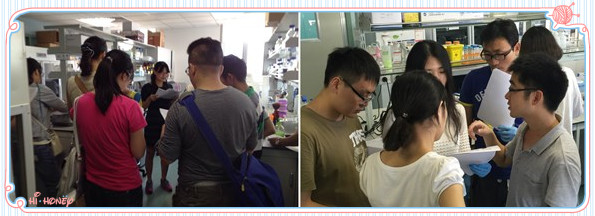 收集好血液樣本后, 每個(gè)小組根據(jù)protocol開始實(shí)驗(yàn)操作,指導(dǎo)人員對(duì)關(guān)鍵步驟進(jìn)行說(shuō)明并進(jìn)行演示,如加樣,溶紅,加抗體混勻,洗滌,避光孵育等步驟。