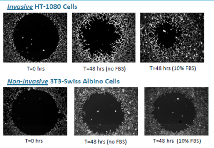 Platypus公司提供了遷移/侵襲新思路,利用間隙封閉法來實(shí)現(xiàn)最接近體內(nèi)狀態(tài)的細(xì)胞遷移和侵襲。不用再穿越物理性的膜(如Transwell),也避免了劃痕的不均一性,原理如下: