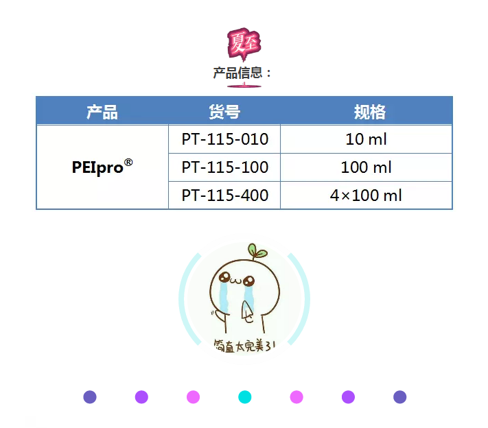 法國(guó)Polyplus推出科研級(jí)PEIpro?和臨床級(jí)PEIpro?-HQ,基于PEI的高品質(zhì)轉(zhuǎn)染試劑,助力car-T技術(shù)研發(fā)和cGMP生物制品的生產(chǎn)應(yīng)用。