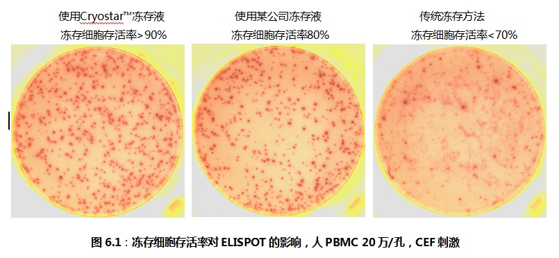 考慮到ELISPOT檢測的特殊性,荷蘭U-CyTech公司經(jīng)過精心的研究與反復的驗證,推出了Cryostar?凍存試劑盒,在凍存液中添加了一系列對細胞有特殊保護作用的保護劑。達科為公司在接到Cryostar?凍存試劑盒之后,在我們的實驗室以及國內(nèi)數(shù)家客戶的實驗室做了細胞凍存與復蘇的實驗,并且對復蘇之后的細胞做了ELISPOT檢測。結(jié)果表明,淋巴細胞的存活率超過90%,ELISPOT斑點形成頻率與新鮮細胞完全相同。參見圖6.1。