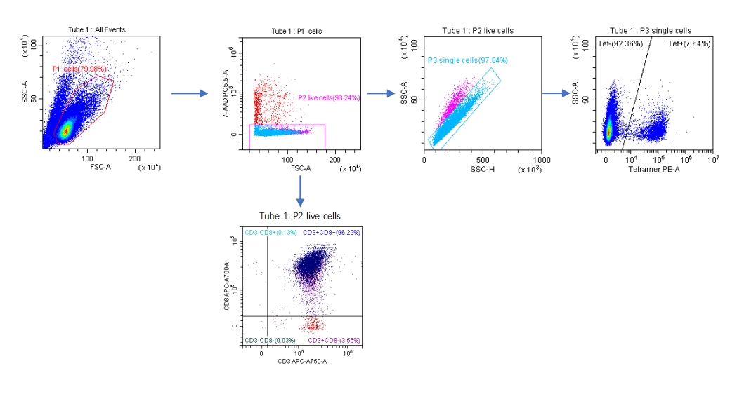 5、使用流式細(xì)胞儀對(duì)細(xì)胞進(jìn)行分析,基于DAPI對(duì)活細(xì)胞圈門(mén),并對(duì)“CD8+ pMHC -四聚體+細(xì)胞”進(jìn)行分類(lèi);