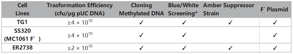 試用裝包含3種電轉感受態(tài)細胞【TG1, SS320 (MC1061 F'), ER2738】,每種感受態(tài)各4個反應;