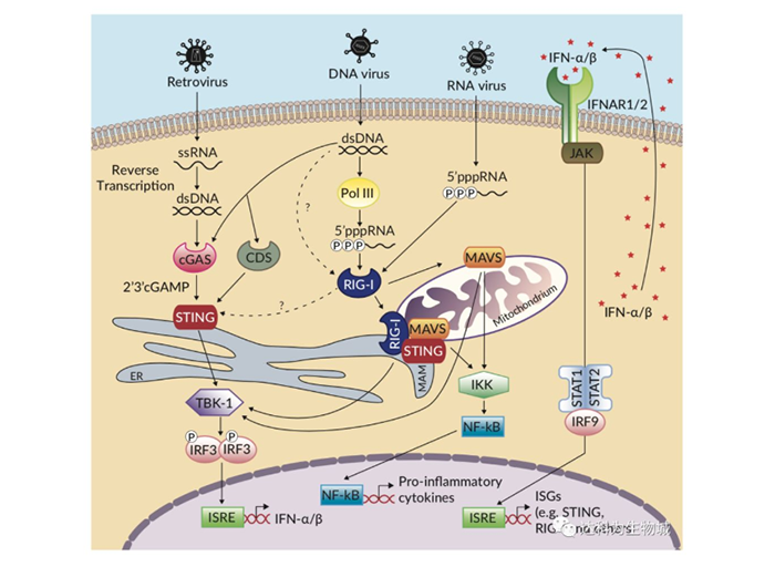 感受器cGAS和RIG-I通過單獨(dú)的接頭蛋白來識(shí)別不同的核酸和信號(hào)。cGAS感受細(xì)胞質(zhì)中異常DNA的存在和濃度,而后通過環(huán)二核苷酸2’3’-cGAMP[2]募集干擾素基因刺激因子(STING, or MITA/ERIS/MPYS)。RIG-I檢測出5`-二/三磷酸末端未加帽的病毒RNA和短平末端雙鏈部分的病毒RNA后,其與線粒體抗病毒信號(hào)蛋白(MAVS, or IPS-1/VISA/Cardif)[1]結(jié)合。它們激活后,cGAS/STING和RIG-I/MAVS將觸發(fā)共同的信號(hào)級(jí)聯(lián)反應(yīng)導(dǎo)致I型干擾素(IFNs)和促炎性因子的產(chǎn)生。