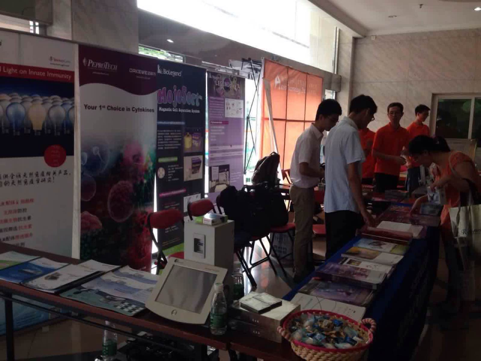 我司在A1號展臺,準(zhǔn)備5副免疫殺撲克牌供展覽用,同時帶來公司的產(chǎn)品目錄冊以及免疫組(小彩圖:mechanisms of cell death,DC、巨噬細(xì)胞,中彩圖:Breg,Treg,th17)等資料以及細(xì)胞組的轉(zhuǎn)染、細(xì)胞治療組的PPT和儀器彩頁等資料供參會人員瀏覽,展臺的兩邊我們放置了多因子、磁珠分選等3個易拉寶供參會人員看,技術(shù)部同事現(xiàn)場進(jìn)行技術(shù)儀機(jī)器演示。