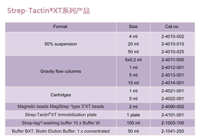 Strep-tag?IBA lifesciences基于生物素(Biotin)和鏈霉親和素(Streptavidin)之間的結(jié)合反應(yīng)開發(fā)的蛋白純化系統(tǒng)。第三代Strep-tag?系統(tǒng):「Strep-Tactin?XT:Twin-Strep-tag?」蛋白純化系統(tǒng),其結(jié)合力可達(dá)pM級別但仍保持結(jié)合的可逆性和固定化蛋白的溫和復(fù)蘇能力。因此,用Strep-Tactin?XT系統(tǒng)能有效提高您目標(biāo)蛋白的純度,解決您實(shí)驗(yàn)中所遇到的常見問題。