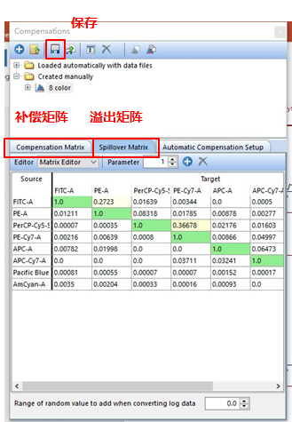 出現(xiàn)補(bǔ)償編輯欄,從PE通道中去除FITC的熒光信號,使PE通道的Mean/Median值與陰性細(xì)胞群一致。
