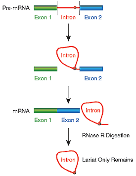 隨著環(huán)狀RNA的深入研究,環(huán)狀RNA制備問題就越來越備受關注。Lucigen提供大腸桿菌來源的RNase R,是一種Mg依賴性的3’ →5’核糖核酸外切酶,能消化基本上所有線性RNA,但不消化套索或環(huán)狀RNA的結構,或者3’突出短于7個核苷酸的雙鏈RNA。即是除了tRNA,5S RNA和內(nèi)含子套索結構外,大多數(shù)細胞RNA都將被RNase R完全消化。如圖4,RNase R可從總RNA中分離出內(nèi)含子前體mRNA剪切產(chǎn)生的套索RNA。以這種方法獲得的RNA作為模板來生產(chǎn)標記的cDNA,可作為含有潛在的內(nèi)含子序列的微陣列的目標,或者用于包含完整的染色體或者基因組的重疊區(qū)域平鋪陣列。產(chǎn)生的cDNA不代表線性內(nèi)含子,但其含有的序列是來源于內(nèi)含子的。