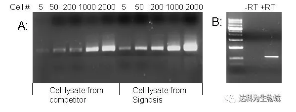 圖2  A: 比較Signosis與其他品牌的細(xì)胞裂解液。分別對(duì)裂解產(chǎn)物中的β-actin進(jìn)行30個(gè)循環(huán)反轉(zhuǎn)錄PCR。