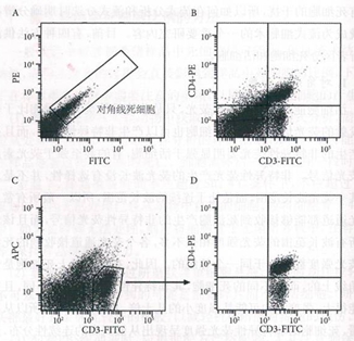 雖然死細(xì)胞位于散點(diǎn)圖的對(duì)角線上,但是對(duì)角線上的細(xì)胞確不一定是死細(xì)胞,因?yàn)殡p陽性細(xì)胞如果在x軸和y軸的熒光信號(hào)相似時(shí),也可以位于對(duì)角線上。所以,散點(diǎn)圖對(duì)角線上的細(xì)胞可能是死細(xì)胞,也可能是雙陽性細(xì)胞。如圖1-B所示,樣本細(xì)胞為正常小鼠脾臟細(xì)胞,標(biāo)記 FITC-抗CD3抗體和PE-抗CD4抗體,F(xiàn)ITC和PE雙陽性的CD4 T細(xì)胞和死細(xì)胞混在一起,無法區(qū)分。但是死細(xì)胞和雙陽性細(xì)胞的形狀是不一樣的,死細(xì)胞呈現(xiàn)連續(xù)的線型分布,而雙陽性細(xì)胞群呈現(xiàn)圓形的群體分布,因此,可以從對(duì)角線上的細(xì)胞群體的形狀大致判斷細(xì)胞的性質(zhì)。雖然不能根據(jù)熒光強(qiáng)度的強(qiáng)弱來區(qū)分該熒光信號(hào)是來自于死細(xì)胞的非特異性熒光還是來自熒光素產(chǎn)生的熒光,但是可以利用在散點(diǎn)圖上死細(xì)胞位于對(duì)角線的特點(diǎn)來區(qū)分死細(xì)胞和陽性活細(xì)胞。如圖1-C所示,x軸表示FITC通道(樣本細(xì)胞標(biāo)記有FITC-抗CD3抗體),y軸表示APC通道(閑置通道),借用該散點(diǎn)圖可以明確區(qū)分圖1-B中無法區(qū)分的死細(xì)胞和雙陽性細(xì)胞。此時(shí)只需要將排除了死細(xì)胞后的CD3 T細(xì)胞設(shè)門,將門內(nèi)的細(xì)胞顯示于新的FITC-PE散點(diǎn)圖中,如圖1-D,此時(shí)該散點(diǎn)圖內(nèi)的細(xì)胞都是活細(xì)胞,因?yàn)闃颖炯?xì)胞同時(shí)標(biāo)記有PE-抗CD4抗體,所以圖中的細(xì)胞明顯分為兩群,雙陽性的是CD4T細(xì)胞,單陽性的是CD8 T細(xì)胞。