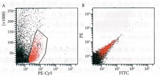 PE-Cy5通道(通常是FL3,接收的熒光波長范圍大致為655-685nm)有時(shí)可用于識(shí)別死細(xì)胞,但首先該通道必須是閑置的通道,及樣本細(xì)胞中沒有標(biāo)記該通道代表的熒光素(PE-Cy5、PerCP等)偶聯(lián)抗體。選擇PE-Cy5-SSC散點(diǎn)圖,一般可看到不成群的PE-Cy5陽性細(xì)胞,這些陽性細(xì)胞的SSC值也是散在分布的,這些散在的PE-Cy5通道非標(biāo)記陽性細(xì)胞,即圖2-A中的紅色部分,將這部分細(xì)胞設(shè)門顯示于FITC-PE散點(diǎn)圖中,如圖2-B所示,這部分PE-Cy5通道非標(biāo)記陽性細(xì)胞基本都位于對(duì)角線部分,而對(duì)角線細(xì)胞一般為死細(xì)胞,所以散在的PE-Cy5通道非標(biāo)記陽性細(xì)胞一般就是死細(xì)胞。