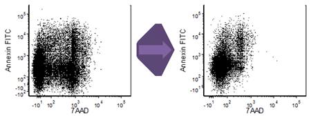 圖為:體外培養(yǎng)一天的C57BL/6小鼠脾細(xì)胞做Annexin V/7-AAD染色的流式數(shù)據(jù)。其中,左邊為未經(jīng)固定處理的細(xì)胞上機(jī)檢測(cè)結(jié)果; 右邊為經(jīng)過70%EtOH, 1.5%PFA固定處理的細(xì)胞上機(jī)檢測(cè)結(jié)果。