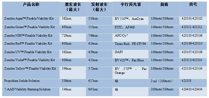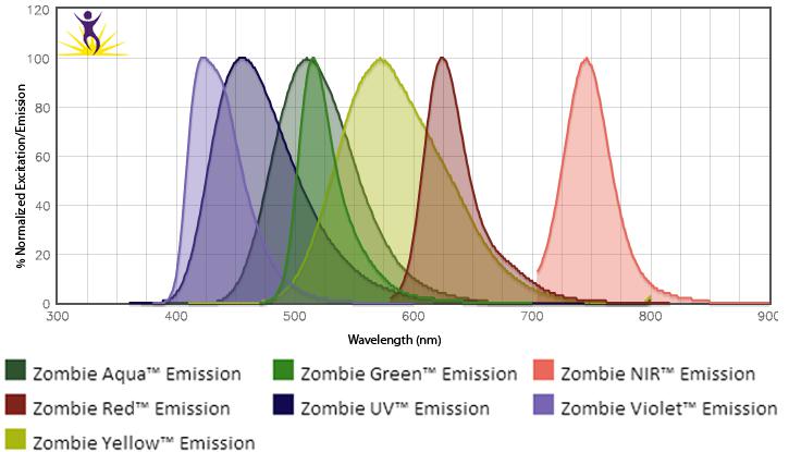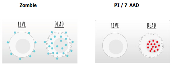 Zombie Dyes有別于PI和7-AAD等DNA染料,它是一種可用于需固定細(xì)胞實(shí)驗(yàn)的染料,通過與細(xì)胞上蛋白質(zhì)的氨基結(jié)合來實(shí)現(xiàn)。因活細(xì)胞可排除染料,所以僅細(xì)胞膜被著色;而死細(xì)胞的細(xì)胞膜及細(xì)胞質(zhì)均被著色,繼而根據(jù)熒光信號(hào)的強(qiáng)弱來區(qū)分死/活細(xì)胞。而且Zombie Dyes可選擇性多,可以由不同的激發(fā)光激發(fā),便于靈活選擇。