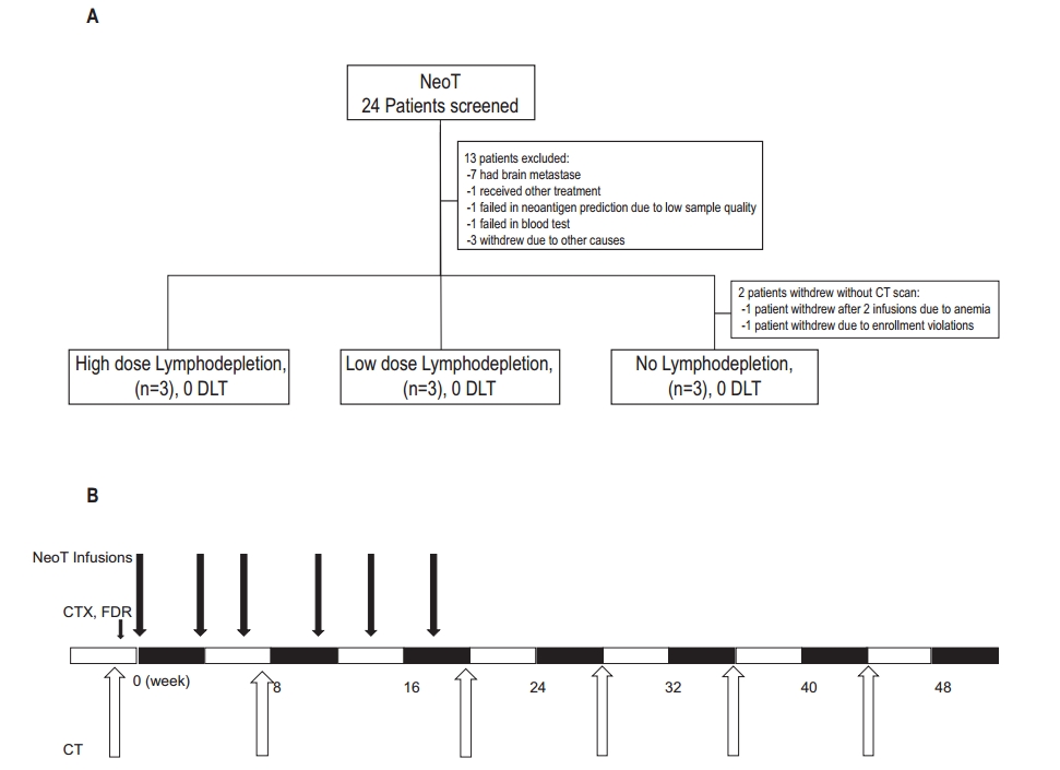 針對(duì)這些問(wèn)題,中山大學(xué)徐瑞華團(tuán)隊(duì)在2023年6月10日發(fā)表了題為“A pilot study of lymphodepletion intensity for peripheral blood mononuclear cell-derived neoantigen-specific CD8+ T cell therapy in patients with advanced solid tumors”的研究論文。該研究開(kāi)發(fā)了一種從癌癥患者的外周血單個(gè)核細(xì)胞(PBMCs)中產(chǎn)生個(gè)性化Neo-T(新抗原特異性CD8+ T細(xì)胞)的方法。作者建立了一個(gè)流程,包括通過(guò)生物信息學(xué)分析預(yù)測(cè)新抗原,并在25天內(nèi)大規(guī)模擴(kuò)增新抗原特異性T細(xì)胞。為了評(píng)估Neo-T治療的臨床療效并確定Neo-T治療的最佳淋巴細(xì)胞耗竭強(qiáng)度,作者進(jìn)行了一項(xiàng)首次在人體中使用氟達(dá)拉濱和環(huán)磷酰胺增加劑量的Neo-T治療的研究。該研究是一項(xiàng)開(kāi)放標(biāo)簽I期臨床試驗(yàn)(NCT02959905),包括標(biāo)準(zhǔn)治療難治的局部晚期或轉(zhuǎn)移性實(shí)體瘤患者。